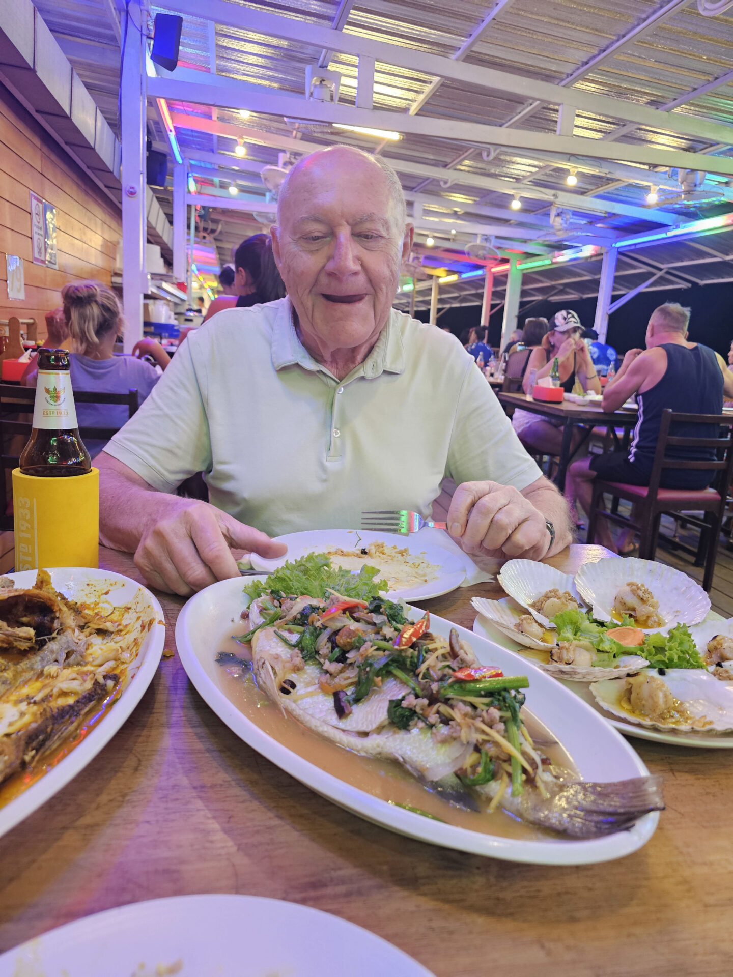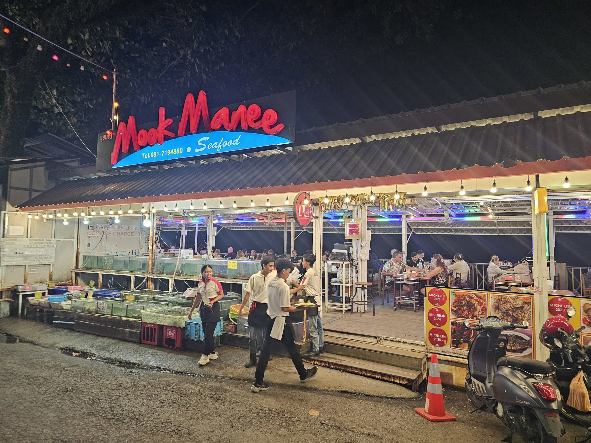 My dad visited me in Phuket! And since he's a huge fan of fish and seafood, I was able to check off another restaurant on my list: Mook Manee in Rawai. It's a restaurant with a very large outdoor dining area on a covered terrace right by the sea. It's very popular, but thanks to its size, there's always a table available.